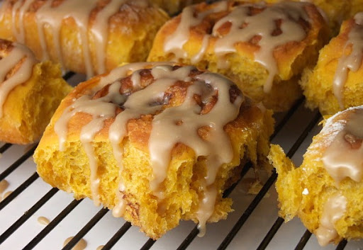 Amish Pumpkin Cinnamon Rolls with Caramel Icing