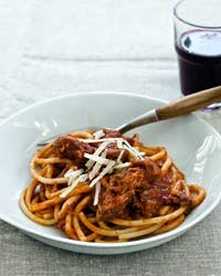 5. Bring a large pot of salted water to a boil. Add the spaghetti and cook, stirring occasionally, until al dente. Drain the spaghetti and return it to the pot. Stir in half of the sauce. Transfer the spaghetti to a platter and top with the remaining sauce. Serve right away, passing cheese at the table.