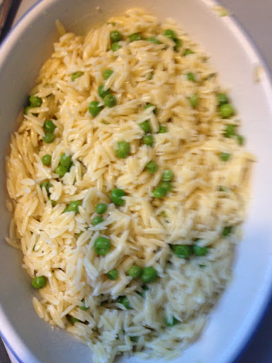 1. Cut Orzo according to package directios with frozen peas until el dente