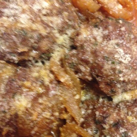 5.Serve steaks with onion sauce ladled over and garnish with parsley and Parmesan cheese
