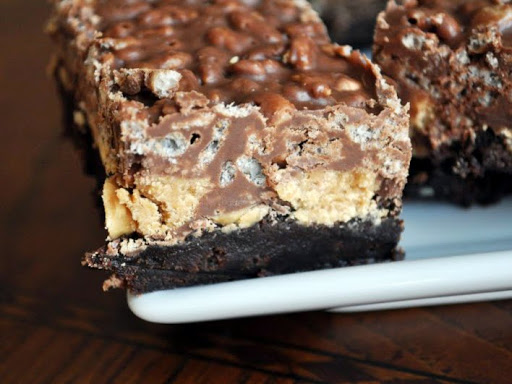 While they are finishing baking, melt chocolate chips, peanut butter and butter. Stir in cereal. Remove brownies from oven and evenly pour chocolate mixture over top.
