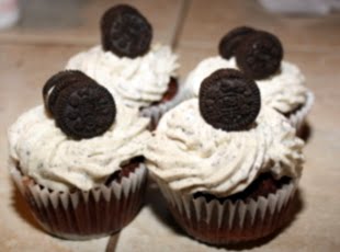6.After cupcakes are cool put frosting on and decorate with a few mini oreos on top