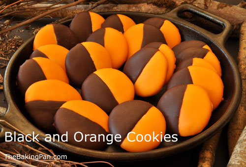 Sift the powdered sugar into a large mixing bowl. Set aside. In a small saucepan over medium heat, combine the corn syrup and water and bring to a boil. Remove from the heat and pour the hot syrup mixture into the powdered sugar. Add vanilla and stir until completely combined and icing is smooth and free of lumps. Transfer half of the icing, about ¾ cup, to another bowl to reserve for the ‘black’ icing. Set aside. With the remaining icing, add orange food color to make the desired shade of orange. Stir until completely combined. The icing should be thin enough to easily spread over the cookies.