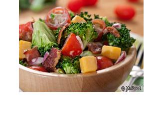 In a large bowl, combine broccoli, tomatoes, onion, cheese, and bacon.