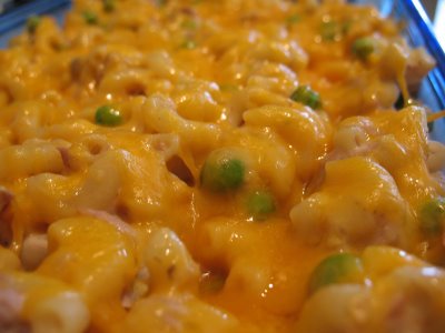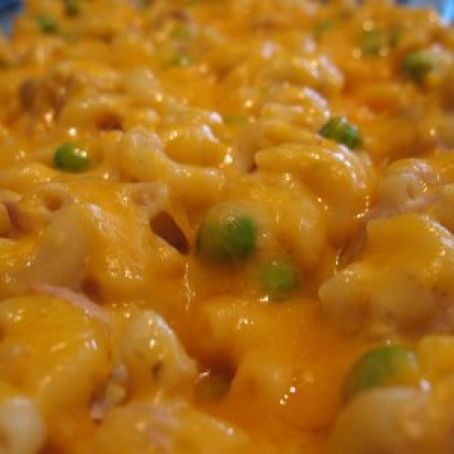 Prepare mac n cheese to box directions. Add all the other ingredients except the peas and mix well. (peas get mushy if added before baking) Bake at 350 for about 15 minutes or the cheddar cheese has begun to melt into gooey lumps. Remove from oven and fold in peas.