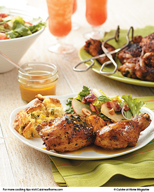 Grill chicken indirectly, skin side up, covered, rotating periodically for even cooking, until an instant-read thermometer inserted into the thickest part of the breast registers 165° and into the thigh or drumstick registers 170°, about 30 minutes. Glaze chicken with sauce, cover, and grill 5 minutes more. Let chicken rest 5 minutes before serving with remaining sauce.