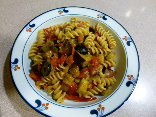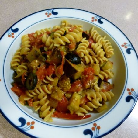 While the pasta is cooking, sauté the onions and garlic until onions are translucent. Return the eggplant to the pan along with the tomatoes, romano cheese (if using), and ricotta (or substitute). Season with pepper. Cook until the ricotta is melded with the vegetables.