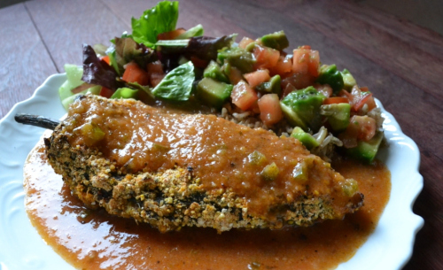 Dip the chilies in the panko/corn starch/flour/corn meal mixture, then the milk and then the panko/corn starch/flour/corn meal mixture again. Place the chilies on the prepared baking sheet and bake 25 to 35 minutes, or until golden brown (I flipped the chilies the last 5 minutes to brown on the other side).