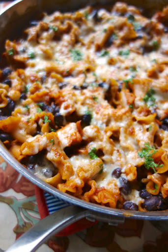 Add onion flakes, garlic powder, enchilada sauce, black beans, broth, cream, and pasta. Bring to a boil. Reduce heat to low and cover skillet. Simmer for 15-20 minutes, until pasta is tender.