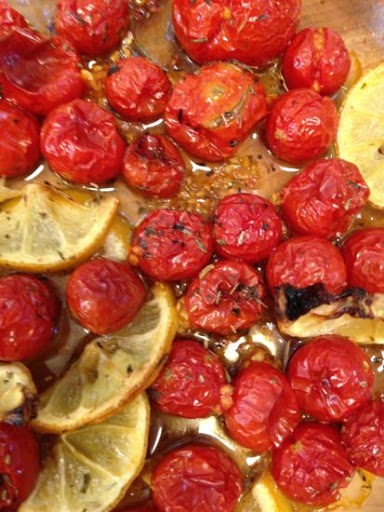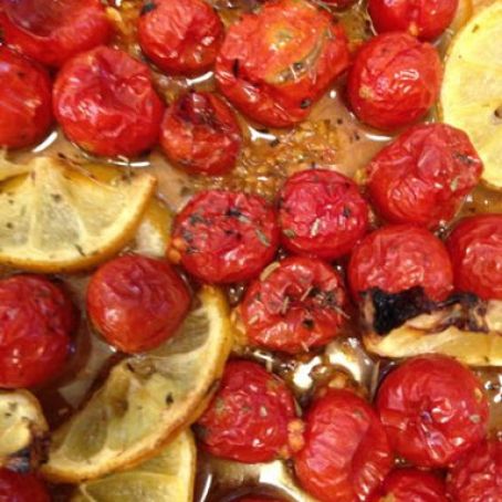 Spread the tomatoes out in a pie pan or baking dish or on a sheet pan. Add the garlic, lemon, Herbes de Provence and oil. Stir to coat everything in the oil.