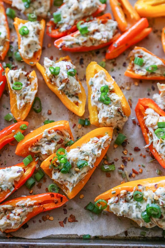 Top the stuffed peppers with any additional toppings, such as chopped green onion, red pepper flakes, cheddar cheese, and/or a dollop of sour cream.