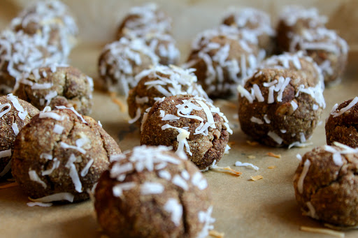 - 2 T. unsweetened, shredded coconut (plus more for rolling)