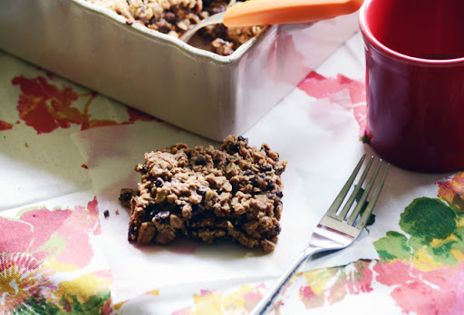 3. In a large bowl mix oats, baking powder, cinnamon and salt together, slowly add to wet ingredients until mixture is just blended. Fold in chocolate chips.