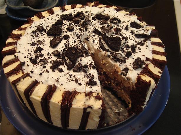 3. Unwrap ice cream sandwiches. Working quickly, cut each in quarters (in half lengthwise and then in half). Stack the strips of ice cream sandwiches on end, packing them snugly together around waxed-paper-lined pan to form the cake's stand up edge. Spoon cookie crumbs into the center of the pan; press firmly over bottom. Freeze 1 hour.