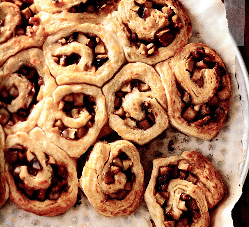 Roll or pat the dough to a 9 x 12-inch rectangle. Spread apple filling evenly over dough, leaving a 1-inch uncovered border along one long side. Roll up dough towards the border; pinch the seam. Gently press the roll until it is 16 inches long. With a serrated knife, cut into 16 rounds. Starting with 5 rounds in the centre, arrange the rounds, touching, on the pizza pan.