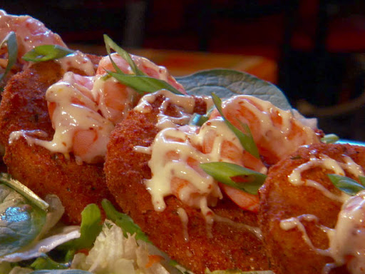 To serve: Line a plate with shredded lettuce. Add 2 slices fried green tomatoes. Top each tomato with 1 boiled shrimp. Fill a squeeze bottle with the remoulade sauce and drizzle decoratively.