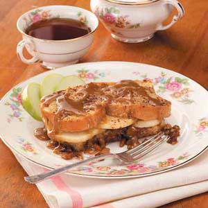 In a small saucepan, combine the brown sugar, butter and corn syrup; cook and stir over medium heat until thickened. Pour into a greased 13-in. x 9-in. baking dish; top with half of the pecans, a single layer of bread and remaining pecans. Arrange apples and remaining bread over the top.