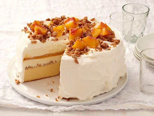 Assemble the cake: Let 2 pints ice cream soften at room temperature until spreadable, about 10 minutes. Coat a 9-inch springform pan with cooking spray and line the bottom and sides with plastic wrap, leaving a 2-inch overhang. Spread the softened ice cream in the prepared pan, then top evenly with the peach puree. Freeze until the puree is firm, about 45 minutes.