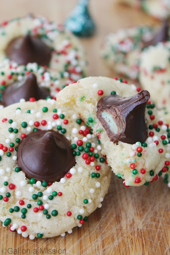 Roll the dough, about 1 tablespoon, into a ball and roll into the holiday sprinkles; place onto the cookie sheet. Do the rest the same way. Bake for 8-10 minutes. Allow the cookies to cool for 5 minutes, then place a kiss on top. Place the cookie sheet in the freezer so the kisses will not melt. I placed the sheet in the freezer for 5 minutes, just enough to cool them down.