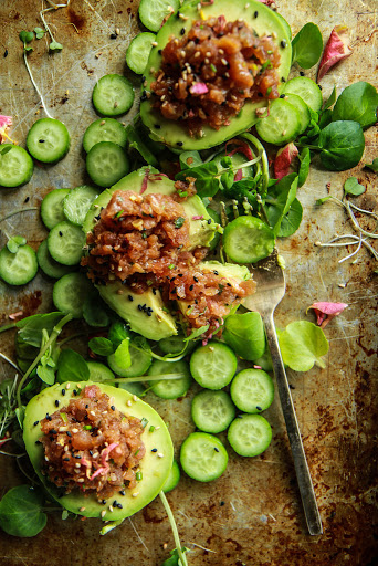 Divide the Tuna Poke between the four avocado halves and then sprinkle the toasted sesame seeds over the top. Serve on a bed of greens and cucumber slices.