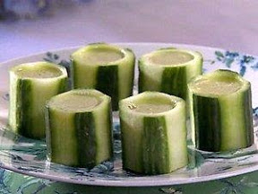 Cut 4 (2-inch) long pieces out of the cucumber. Use a melon baller to carefully scoop out flesh from 1 end, leaving a 1/2-inch bottom on the other end. Repeat with remaining cucumber pieces, reserving cucumber flesh.