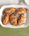 When cool enough to handle, halve sweet potatoes lengthwise. Scoop out all but 1/4-inch flesh from inside skins. Arrange 8 skins in a single layer in a 9-by-13-inch baking dish (discard remaining 2 skins). Place flesh in a food processor, along with 2 tablespoons butter and goat cheese; season with salt and pepper. Process until smooth, 2 minutes. Add chives and pulse to combine; spoon into skins.