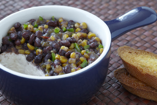 Mix together the dressing mix, preserves, corn, chilies and black beans. Place each brick of cream cheese in a shallow ovenproof pan or on a cast iron fajita skillet. Top each brick with half of the bean mixture. Bake for 30 minutes. Garnish with jalapeño slices and serve with tortilla chip dippers.