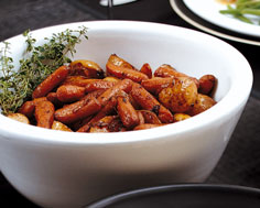 Roasting the potatoes covered with foil kick-starts the cooking and allows the wonderful flavours of garlic, thyme and balsamic vinegar to infuse. Regular carrots can be used in place of the baby carrots. If substituting, use about 4 medium-sized carrots, peeled and cut into chunks on the diagonal. Heating the vegetables quickly on the stovetop just before serving prevents them from drying out and gives off a great aroma.