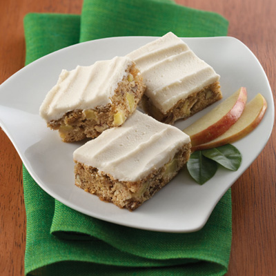 Combine 1 cup butter, sugar and brown sugar in large bowl; beat at medium speed until creamy. Add eggs and 2 teaspoons vanilla; continue beating until well mixed. Reduce speed to low; add all remaining bar ingredients except apples and pecans. Beat until well mixed (mixture will be very thick). Stir in apples and pecans.
