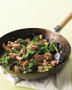 2. In a wok or large skillet, heat vegetable oil over high. Add chicken and cook until browned, 10 minutes. Add ginger, garlic, scallions, and broccoli and cook, stirring frequently, until broccoli is bright green, 3 minutes. Add 1/4 cup water, scraping up browned bits with a wooden spoon. Stir in soy sauce mixture and cook, stirring, until thickened, 1 minute. Serve warm with rice.