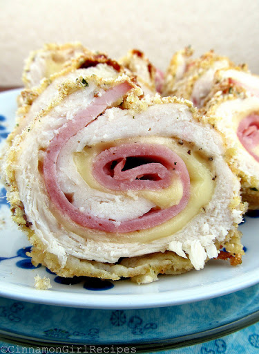 Season the chicken cutlets lightly on each side with salt and pepper. Place a slice each of swiss and ham (trim to fit the cutlet, if needed) over top and roll up beginning from the smallest end of the chicken. Secure with a toothpick or two. Repeat until they are all rolled up. Dredge one at a time by dipping into the egg and then into the bread crumbs using your hands to pat the crumbs on. Set in roasting pan and repeat until all are covered with crumbs.