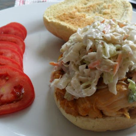 Remove the chicken from the slow cooker and place in a large bowl. Shred the chicken with two forks. (The chicken will be extremely tender, so it will almost fall apart itself.) Toast the hamburger buns. Place some of the BBQ chicken on a toasted bun and top with coleslaw. Enjoy!