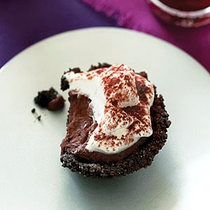 7. Remove pies from trays. Whisk cream with remaining 2 tbsp. sugar into soft peaks. Spoon a dollop of cream onto each mini pie. Dust pies with remaining cocoa.