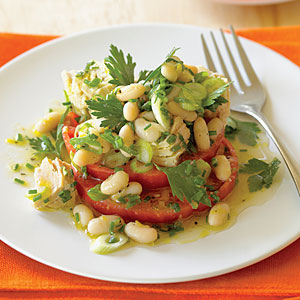 1. In a medium bowl, whisk together oil, lemon zest and juice, salt, pepper, and chives. Add parsley leaves, beans, tuna, and onions and stir gently just until coated.
