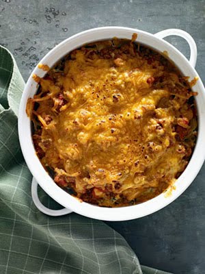 Transfer noodle mixture to prepared dish. Top with beef and sprinkle with remaining cheese. Bake at 350° for 30 minutes. Cool slightly before serving.