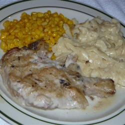If your skillet is oven safe, sprinkle onion soup over the pork chops and cover with the soup mixture. (If your skillet is not oven safe transfer into a baking dish)