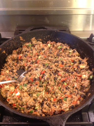 ~Add 1/2 cup picante sauce, black beans, bell pepper, cumin & salt. Simmer for 7-8 minutes. Add green onions and bacon.
