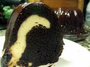 Rich Fudge Ribbon Bundt Cake with Shiny Kahlua Chocolate Icing