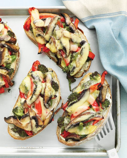 Meanwhile, in a small bowl, combine mayonnaise and garlic; season with salt and pepper. Place bread on a work surface. Dividing evenly, spread with mayonnaise mixture, and top with vegetables, then cheese. Place on baking sheet, and broil until cheese is melted and lightly browned, 2 to 4 minutes.