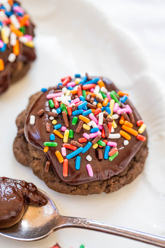 There are chocolate chips and cocoa powder in the cookie dough and the cookies topped with a rich, cream, fudgy chocolate ganache. There are two tablespoons of cream in the dough which makes the cookies creamy and moist but also makes for a very soft dough so it must be chilled before baking. The cream also helps combat dryness which can plague chocolate cookies because of the drying effects of cocoa powder. Make sure not to overbake. The ganache is easy and perfectly traps the sprinkles.