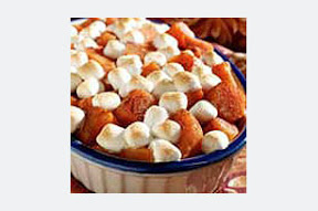 Heat oven to 350 degrees F. Pour sweet potatoes in a 10x6-inch baking dish coated with cooking spray. In separate bowl, combine all ingredients except marshmallows. Mix thoroughly. Pour mixture over sweet potatoes. Top with marshmallows. Bake 18-20 minutes or until marshmallows are lightly browned.