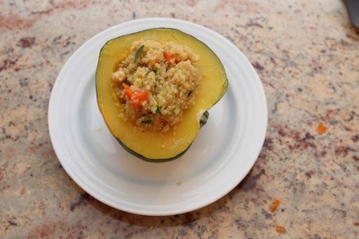 Turn cooked squash face up and scoop quinoa stuffing into each dividing the entire amount it evenly among the squash bowls.