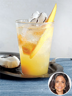 Mix in a 16-oz. glass filled with mango slices and ice.