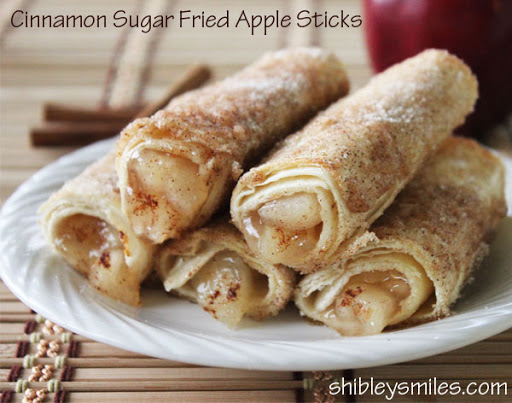 Cut tortilla into four squares, each tortilla will make four Cinnamon Sugar Fried Apple Sticks