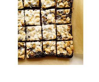 In a small bowl, combine chocolate chips and walnuts; sprinkle evenly over crust. Drizzle milk over top; sprinkle with marshmallow pieces. Bake until chocolate melts and marshmallows begin to brown, about 15 minutes. Cool completely in refrigerator before slicing into 16 pieces.