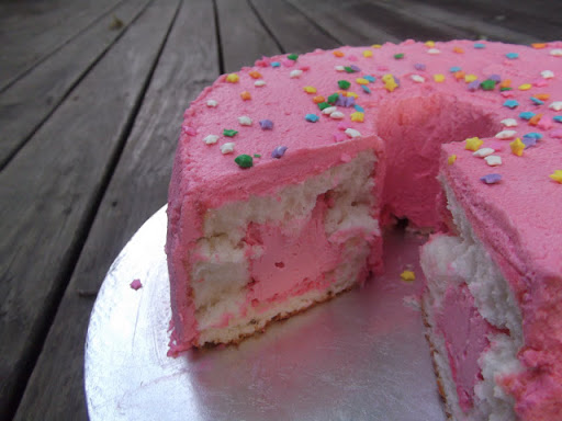 To make the waldorf: remove the frozen cake and use a large serrated knife to cut off the top one inch of the cake. Carefully cut the middle of the cake out leaving one inch on all sides. Fill with strawberry milk whipped cream and replace top. Freeze for another 15 minutes. Frost with remaining whipped cream. Serve immediatly or freeze. Cake can be cut directly from freezer and eaten.