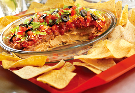 Spread the beans over the cream cheese mixture. Top with the salsa, cheese and lettuce. Top with the olives and tomatoes, if desired. Serve immediately or cover and refrigerate until ready to serve. Serve with the tortilla chips for dipping.