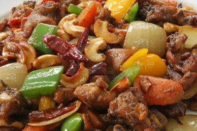 Ponga el pollo frito (¹), la cebolla y los chiles, las nueces de la india. Revuelva freír por un minuto.