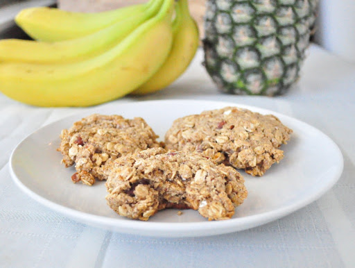 Preheat oven to 350. Mix all the dry ingredients in a large bowl. Mix all wet in a medium bowl. You may need to heat the peanut butter to soften it a bit. Drop cookies onto a lined baking sheet and bake for 15-17 minutes. Wait 10 minutes to cool before removing.
