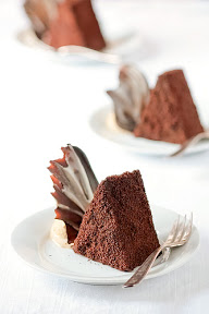 Place one cake layer in a springform pan, top with the mousse and place the second cake layer on top. Refrigerate until the mousse is firm, about one hour. Run a knife dipped in hot water around the edge of the cake and unmold. Use a long knife to cut the cake into 8 slices and make sure to dip it in hot water and wipe it clean each time to get clean cuts. Trim the ends of each slices to obtain triangles. Coat each piece with the reserved cake crumbs.
